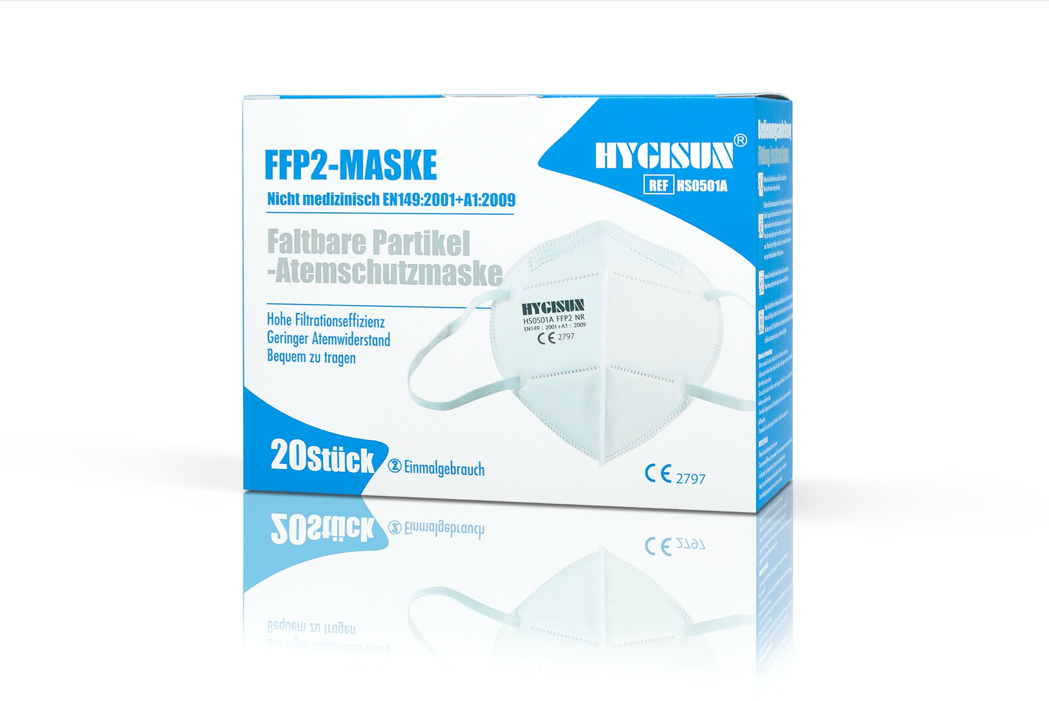 Die Hygisun FFP2-Masken ohne Ventil bieten Schutz vor partikelförmigen Schadstoffen wie Aerosol, Staub und Rauch. In Europa werden diese Masken nach EN 149:2001+A1:2009 auf Schutzeigenschaften für den Träger genormt.